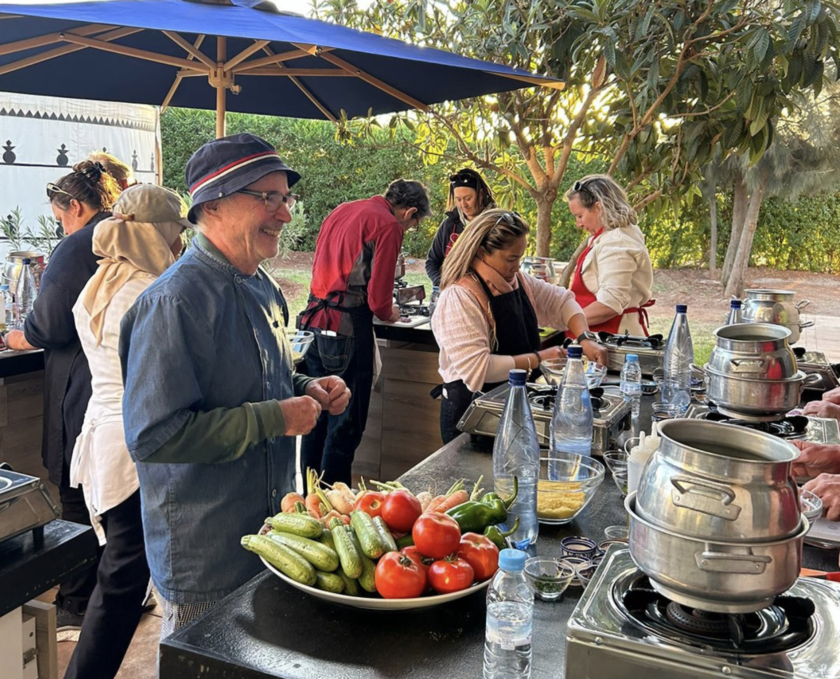 During the tour, we will gather our ingredients for a cooking class at the Palais Amani — a meticulously restored 19th-century palace with carved cedar ceilings and hand-laid zellige tilework. The class moves to a rooftop kitchen with views over the medina's rooftops and minarets. You'll learn the techniques behind dishes that can't easily be replicated at home without knowing the how: the layering of spices in a slow-cooked tagine, the paper-thin pastry of a bastilla, the right balance of preserved lemon and fresh herb. The chef teaches hands-on, adjusting and explaining alongside you. Afterwards, enjoy the fruits of your labors!
