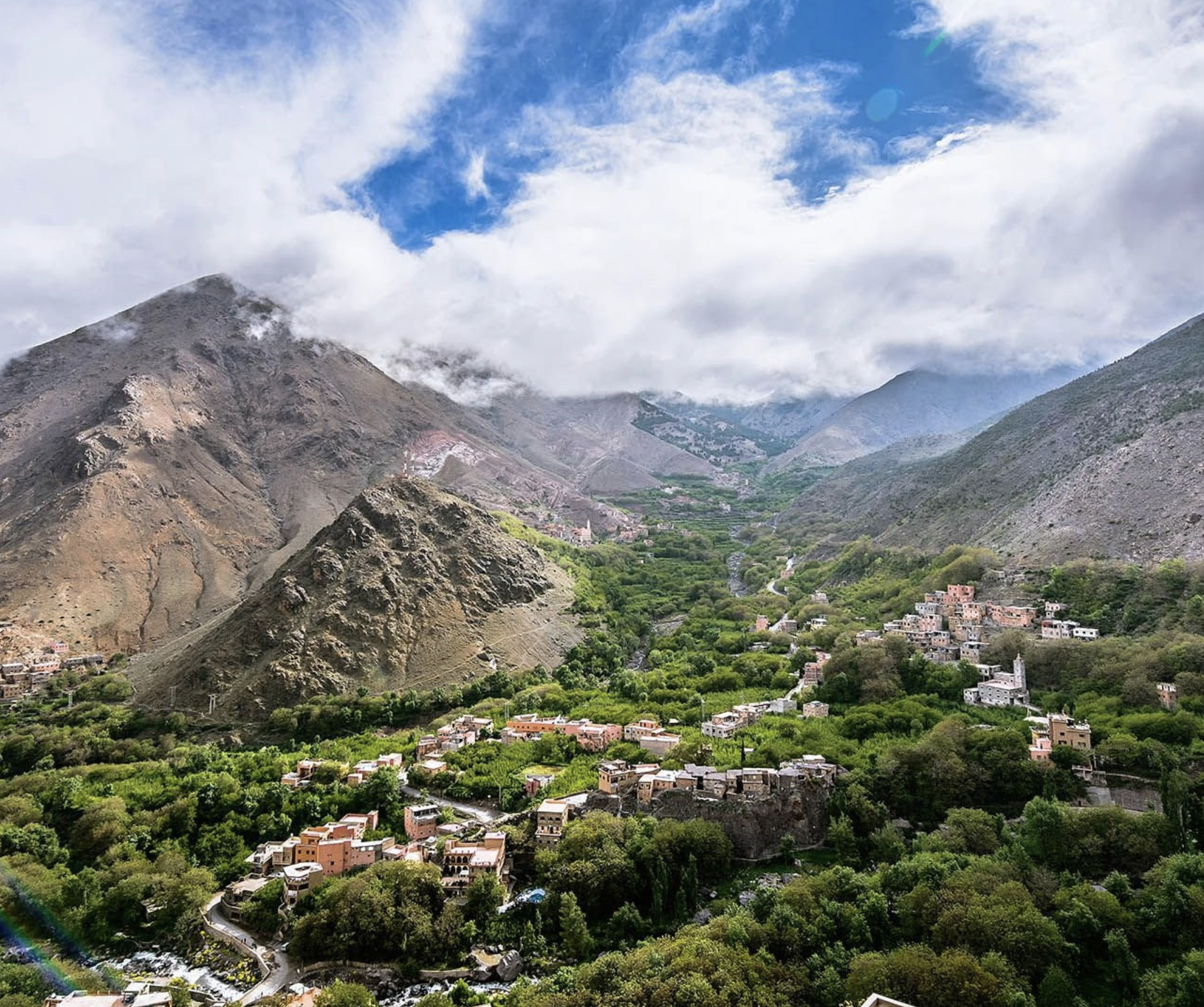 After breakfast, head south into the High Atlas to the Imlil Valley — one of Morocco's most beautiful mountain landscapes. At almost 6,000 feet, the valley is a patchwork of terraced walnut and fruit orchards and pink-hued Berber villages, with the snow-capped peaks of Mount Toubkal rising behind.